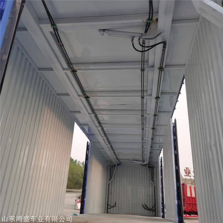 具有以下几个特点: 1.装卸效率高 厢体翼板大举升高度高过前后板,在后门敞开的状态下,可以多角度装卸货物,极大地提高了装卸效率,更加适应现代物流货物装卸方便、快捷的要求; 2.密封性好 厢体边板竖框与立柱之间及翼板与前后板之间都装有密封条以及,实现了整个厢体的密封,顶部有防雨蓬布与顶片铆接,使整个车厢体具有防雨、防尘、环保等性能,是一种全天候的运输A,可有效保证货物高质量的运输; 3.操作简单,安全防盗,安全性能可靠;动力部分选用国内液压系统,举升油缸选用缸径Ф45、行程400、系统压力16Mpa,举升力大、运行可靠,液压系统采用按钮式开关进行升降控制,可使翼板在升降时停止在任何位置,操作简单方便。