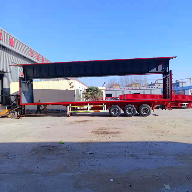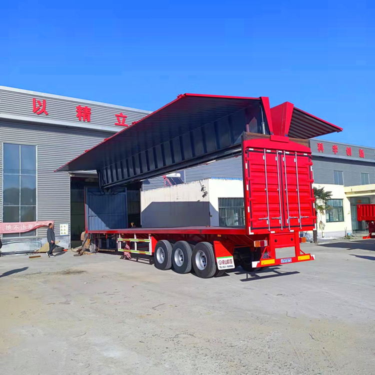 为了适应大型物流公司的需求,3轴飞翼半挂车正式列为工信部生产型号,为优化场地限制,使车辆在没有大型室内外场地装卸的情形下,能满足叉车后门单一装卸,公司专门研发了卧顶式飞翼,大大增加并满足了叉车托盘进入车厢需求,其车的优点是:1.外饰铝波纹板或铝平板,内饰镀锌板2.厢体下端50cm高是栏板,底部装卧环,便于固定货物3.电液一体化举升装置,由一个动力单元控制电钮控制举升,两翼可举升90度4.厢体四个液压双回路吸附油缸5.此车密封性好,防尘、防盗、防雨,适合机械快速装卸,主要用于重型设备、服装等企业使用。这种厢式专用车,便于侧面装卸货物,而普通厢式车只能从货厢尾门装卸,不能快捷地装卸货物,为了提高物流效率,需要厢体两侧也能完全敞开,装卸设备可以直接从两侧对货物进行装卸作业。翼开启式车就实现了两侧厢板开闭,大幅度缩短了货物装卸时间。