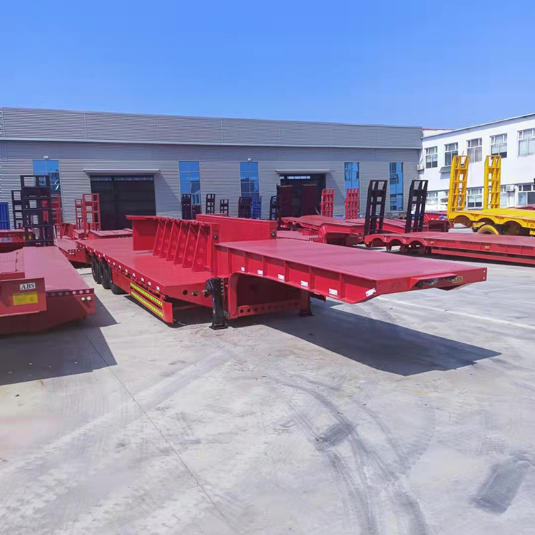 低平板半挂车通常采用凹梁式(或者井型)车架,既车架前段为鹅颈(鹅颈前段的牵引销与牵引车上的牵引鞍座相连,鹅颈后端与半挂车架相连),中段为货台(车架低部分),后端为轮架(含车轮)。在往低平板半挂车上装载机械设备时,通常是从半挂车后端装载机械设备,即采用从后轮架上 面移动机械设备或者将车轮移除的方式, 然后再将机械设备固定在半挂车上。低平板式半挂车行走结构使用高强度钢材质,整车自重轻,并保障其抗扭曲、抗震、抗颠簸能力、满足不同的路面承载能力。
