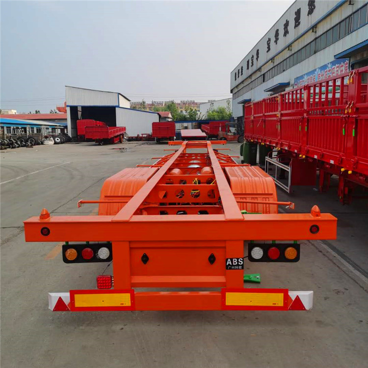 系列集装箱运输半挂车的车架全部喷丸处理,整个车架是在的定位台架上组装、焊接而成,其结构合理、强度高、外形美观。在车架上设置了集装箱紧缩装置,可以装载40英尺、20英尺两种标准集装箱。前后端的四个集装箱紧缩装置为固定式结构,中间集装箱紧缩装置为可藏式结构。骨架式车驾由纵梁、横梁和前、后端梁焊接而成,纵梁采用钢板16Mn埋弧焊接成工字形(主要尺寸有450、500),横梁采用钢板冲压成槽型,前后端梁为焊接式矩形截面。中间集装箱锁紧装置部位设置了整体式长横梁,以提高集装箱锁紧装置的承载能力。集装箱骨架车重量是5.1吨左右,用的是高强度板材,采用特殊的焊接技术。优点本公司的车辆轴距小,后悬大,减轻了中间受力,抗载能力强。使用高强度钢材,先进的技术,的设计,造出新以代轻型半挂车;