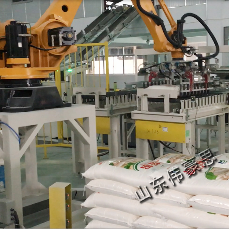 袋装尿素码垛机器人可不间断作业,本来需要三四个人的工作,可能只需要一个人就足够了,人力减少了,员工的工资以及保险也会相应的减少,因此可以很快的进行回本生产,还可以避免由于操作劳累或疏忽而造成的人身事故。使用袋装尿素码垛机器人设备可以实现多批次、连续生产,既减轻了工人的劳动强度,又保证了产品的质量。