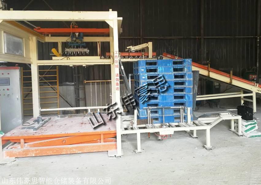 工业原理:斜坡输送机将料袋提升到码垛高度,经压平整袋机,送至旋转抓手进行层码垛,在推袋压袋机、旋转抓手和升降机的协调工作下,层码垛完成后,升降机自动下降一层料袋的高度直至码完为止。垛盘由垛盘输送机送出.由叉车下线入库。