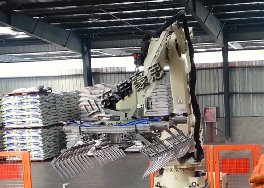 由全自动供袋机,自动定量包装机,折边热合缝包机,倒袋整袋机,金属异物检测机,重量复检机,输送剔除机,大字符喷码机,托盘库和输送设备,机械手码垛机(高位码垛机),自动控制系统,其他选配设备,除尘系统组成。