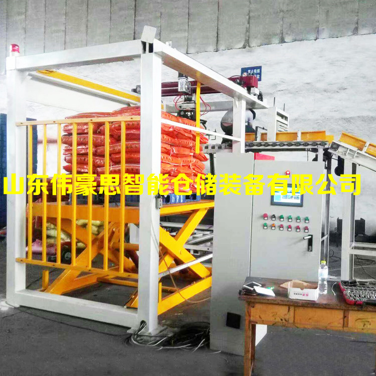 高位全自动码垛机主要由:爬坡输送机、过渡缓冲机、压袋机、转袋调姿装置、编组装置、袋盘输送机、托盘自动供给机、成品托盘输送机等组成。