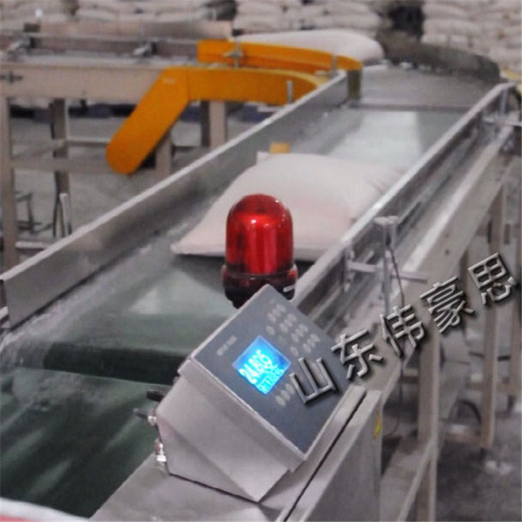 自动供袋——自动称重包装——缝包机——喷码——输送——倒袋整形机 ——金属检测机 ——重量复检机——剔除——垛盘输送——机械手码垛——除尘系统——缠绕——出垛——AGV小车自动搬运输送。