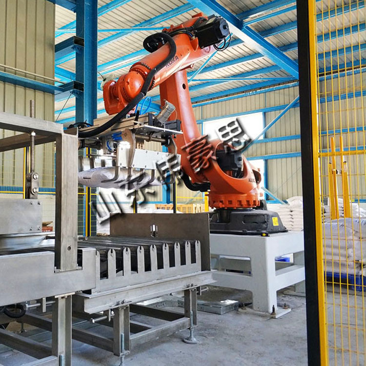 肥料全自动码垛机可以设置在狭窄的空间,全部控制可在控制柜屏幕上操作即可,操作非常简单。通过更换抓手即可完成对不同货物的码垛,相对降低了客户的购买成本。