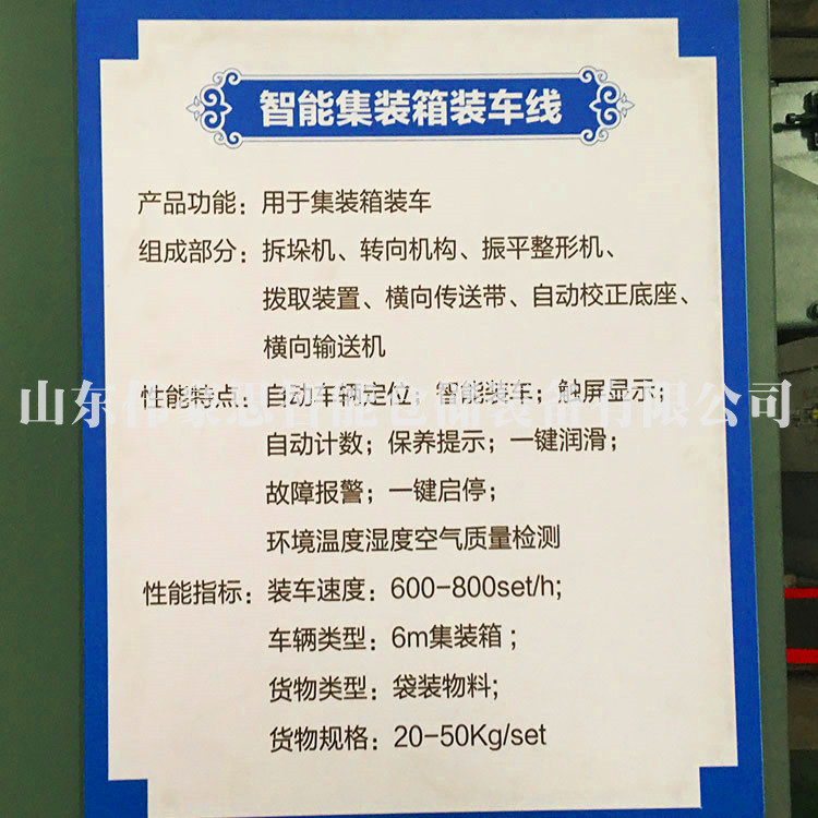 添加剂集装箱自动装车机采用智能技术,能实现一键启停;智能拆垛、整平、输送线、换向;智能定位;智能装车;触屏显示;视觉监控;自动计数;保养提示;一键润滑;故障报警;环境温度湿度空气质量检测等功能。
