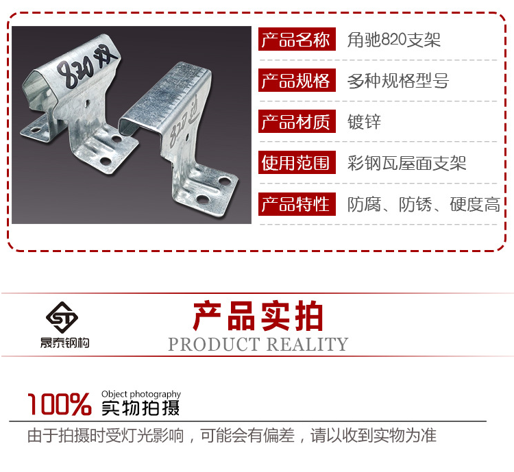 产品用途:支架的规格型号和彩钢板的规格型号匹配着使用,多用于大跨度的钢结构厂房,支架固定在檩条上,起到固定支撑屋面彩钢板的作用,相对于自攻钉,它具有可隐藏性,不易漏水而且受力好等优点。