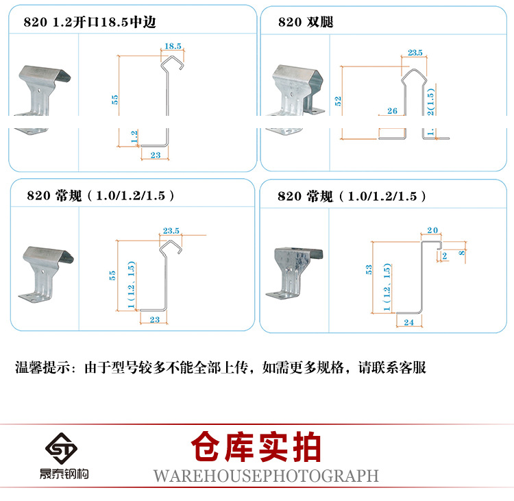 820支架是1.0/1.2/1.5*55高的,55mm的高度一般用于角驰820彩钢瓦的单瓦上,如果您在搭建过程中,角驰彩钢瓦和檩条之间有棉的话,就要考虑用特殊型号的支架了。特殊加高的760支架有85/90/100/110/115/125较高的可以加高到150,这个高度同样是根据玻璃丝绵和岩棉的厚度来定做的。