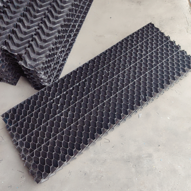 金日冷却塔收水器在收水器的片材中融入了进口碳黑,有效提高了片材的抗紫外线、大大增加了收水器的抗老化特性。该收水器具备收水效率高、气流阻力小、强度高、不变形、安装维修便捷、使用期长、阻燃性好等优势。