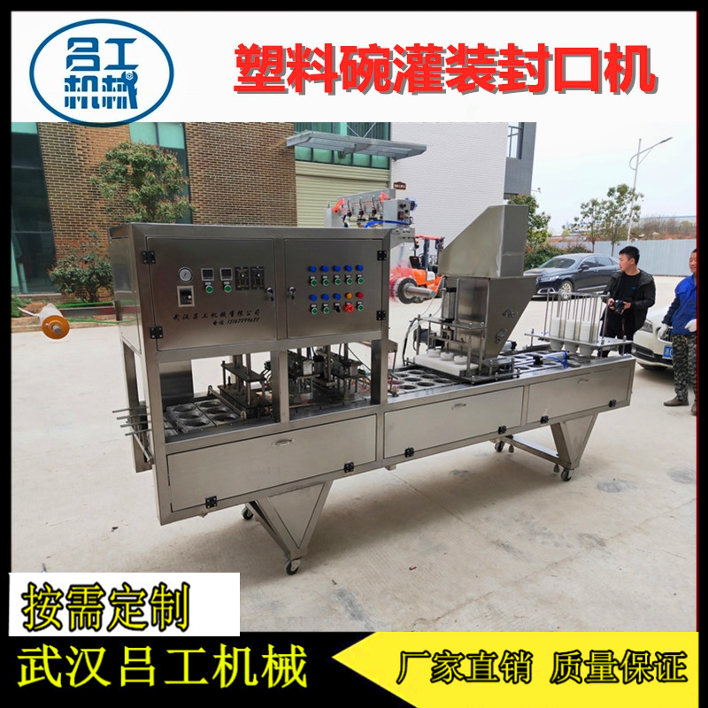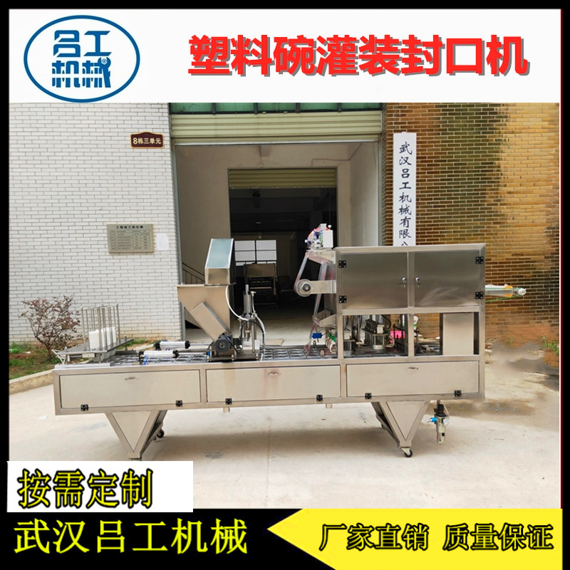 多头秤自动称重分料碗装麻辣萝卜干抽真空封口机适用于碗装萝卜干产品的生产,具有自动称重、自动分装、自动光电对膜、自动抽真空、自动封口、自动切膜、自动收废膜和自动输出盒子等功能。