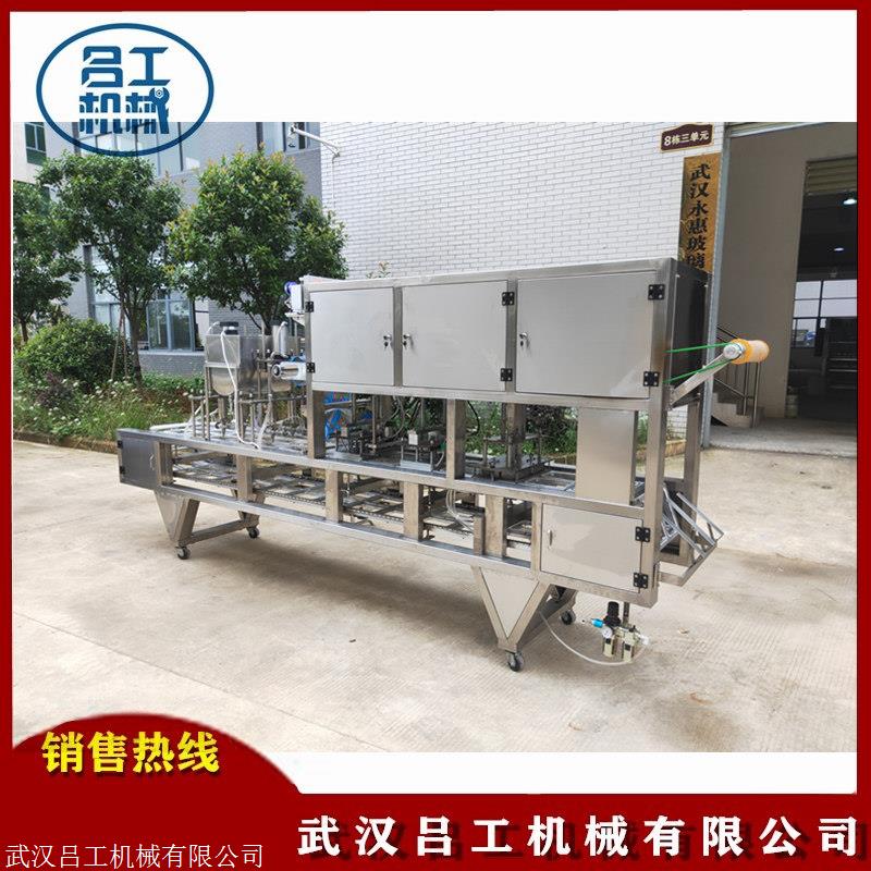 方盒灌装封口机从送杯、充填、液位控制、光电对膜、两次封口、出杯为全自动作业。