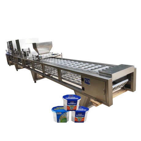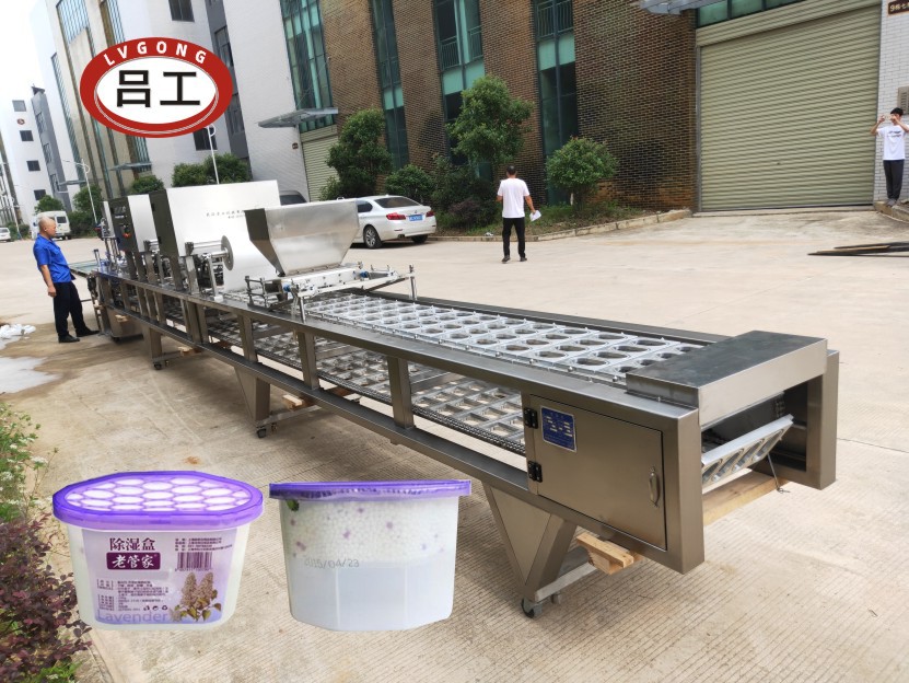 主要功能:自动落盒、自动定量灌装、自动封口(无纺布),自动二次封口(铝箔膜),自动切膜,除湿桶自动出杯到输送带进行下一个贴标程序.