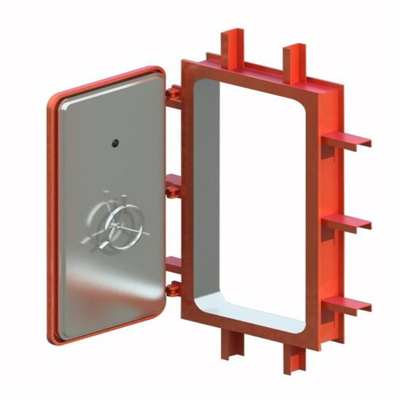 避难硐室门有门扇、门框为平钢板、筋板、型钢等组焊而成;锁闭机构采用双道紧密锁;门枢采用推力球轴承,方便开启。