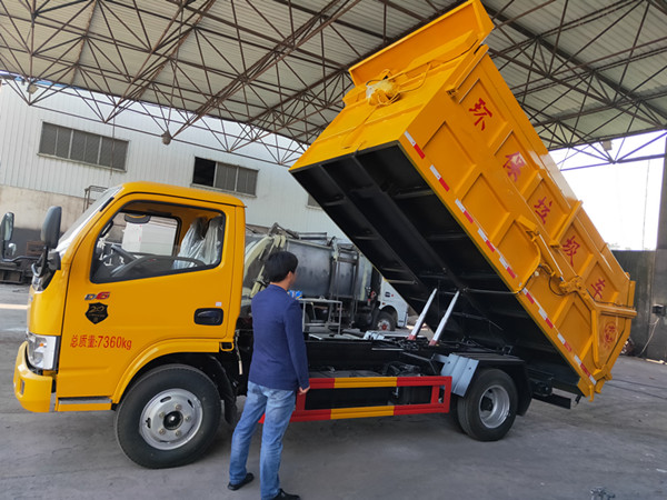 自装卸式运输污泥车:配挂桶提升机自动提升铁通,箱体液压油缸举升自卸,后盖液压油缸开启密封条密封。后盖关闭后,整个车厢内四周达到全密封状态,运输中滴水不漏,避免了道路二次污染,符合绿色环保运输标准。