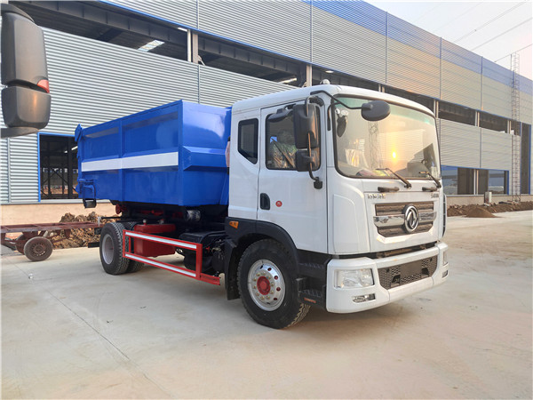 一车配多箱车厢可卸式垃圾车-收集运输污泥、粪污车。运输能力强成本底。可将车载垃圾箱放置到各个收容点,待收集装满后,该车可直接开赴至收集点,通过液压系统的操控,可将垃圾车后座上加装的勾臂放下,挂住站内垃圾箱前端的连接点,将垃圾箱拉至车体的后座上,此时即可开动车辆,将污泥运送至处理站内,进行自卸式倾倒。