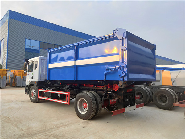 自装卸式运输污泥车:配挂桶提升机自动提升铁通,箱体液压油缸举升自卸,后盖液压油缸开启密封条密封。后盖关闭后,整个车厢内四周达到全密封状态,运输中滴水不漏,避免了道路二次污染,符合绿色环保运输标准。