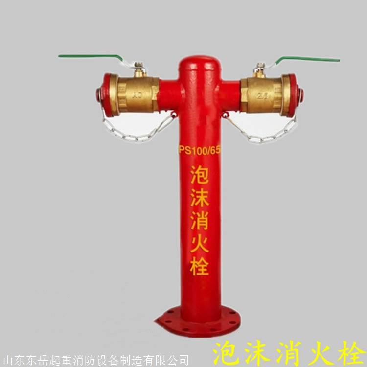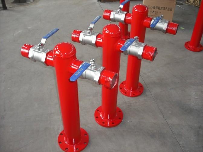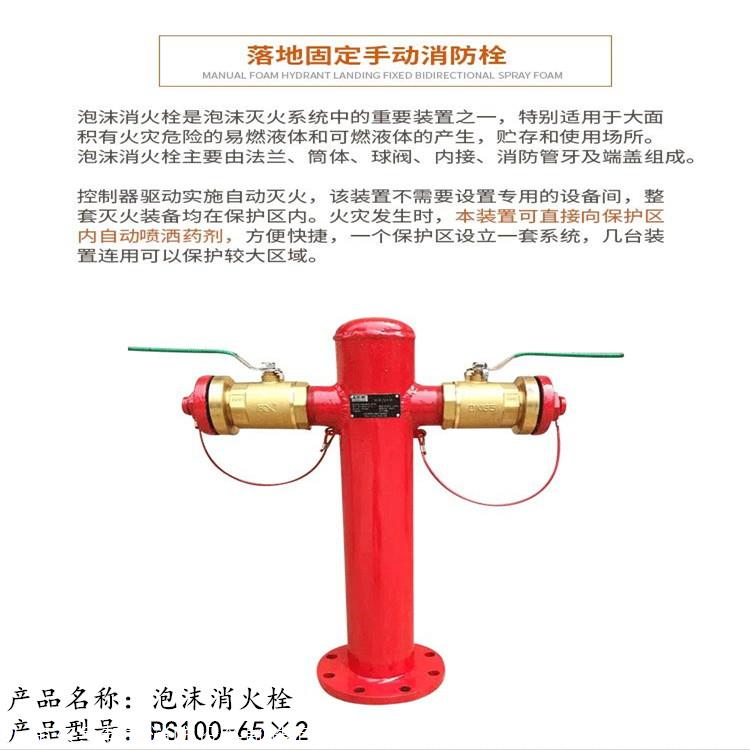 泡沫消火栓是泡沫灭火系统中的重要装置之一,特别适用于大面积有火灾危险的易燃液体和可燃液体的产生,贮存和使用场所。泡沫消火栓主要由法兰、筒体、球阀、内接、消防管牙及端盖组成。地上式泡沫消火栓根据法兰接口分为PSS80-65X2、PSS100-65X2、PSS150-65X2三种型号。泡沫消火栓额定工作压力为1.6MPa范围内。