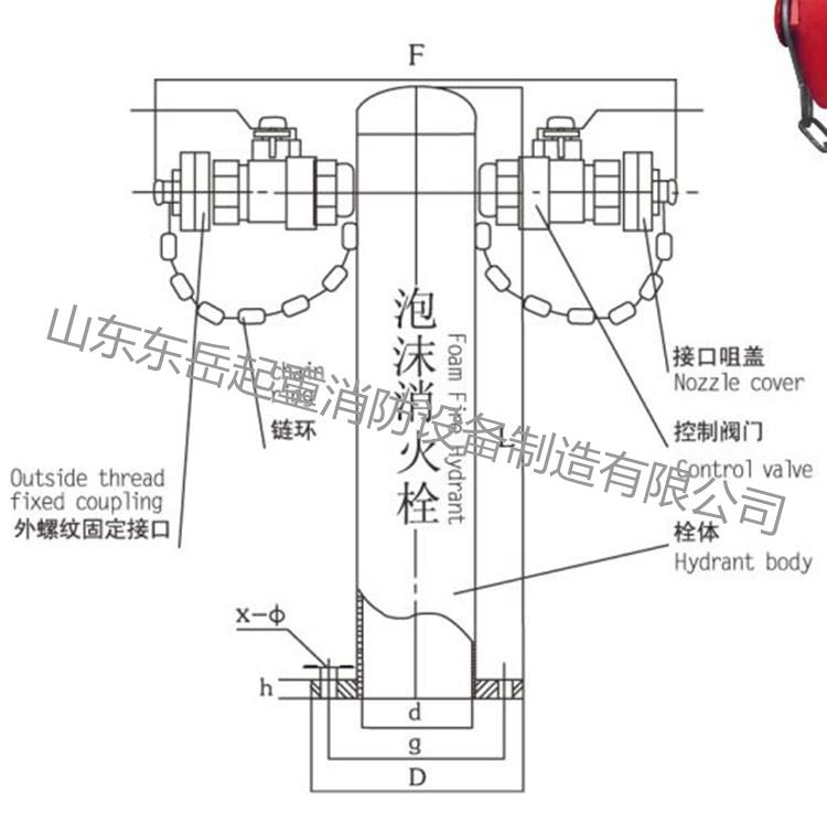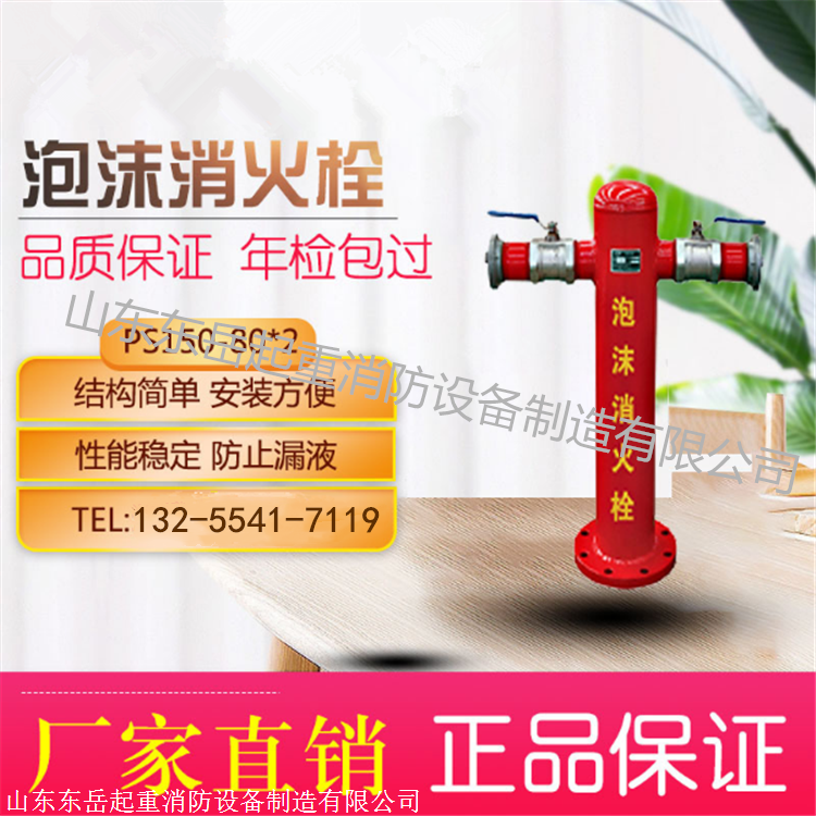 山东东岳起重消防设备制造有限公司生产的泡沫消火栓有两个直径65MM的出水口,供连接消防水带放出空气泡沫混合液使用。如果用移动式空气泡沫炮灭火可以同时连接两个出液口;如果只用一个出液口用空气泡沫枪灭火,可将另一个出液口封死,防止漏液,以免影响液流压力。使用时应先接好水带和喷射设备才能打开出液阀,应注意阀门的开关方向。