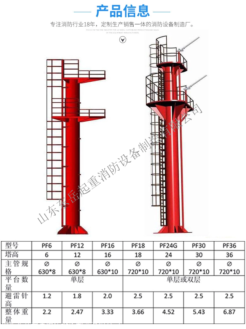 山东东岳起重消防设备制造有限公司生产的PT系列消防炮塔从结构为螺旋钢管结构和格构式结构两种规格;从使用性能可分单操作平台和双操作平台。操作平台周围设置1.2米栅栏式护栏,顶部操作平台设有避雷装置,每层操作平台均配有水喷淋冷却降温系统,且每层操作平台均可同时设置消防水炮和泡沫-水两用炮;上下爬梯设有护笼,增加了安全性能。山东东岳生产的消防炮塔设计科学、工艺先进,技术成熟,价格低廉、抗风防震、供货周期短、安全性能高,可根据客户要求量身订做。