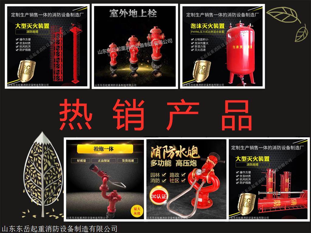 山东东岳起重消防设备制造有限公司主要产品有PS系列固定式消防炮、PL系列泡沫-水两用炮、PSY系列移动式消防炮、PSKD系列固定式消防炮、PSKDY系列移动式消防炮、自动跟踪定位射流灭火装置、SSFT系列地上消火栓、栓炮一体式消火栓、PZK系列消防炮座、PS系列泡沫消火栓、PY系列半固定式(轻便式)泡沫灭火装置、PHYM(L)系列压力式比例混合装置、PQ系列泡沫枪、PHP系列平衡式泡沫比例混合装置、PSG系列泡沫消火栓箱、PC(L)系列低倍数空气泡沫产生器、PT系列消防炮塔、FQS系列消防球阀、钢制储罐消防冷却喷淋装置、泡沫灭火剂等200余种消防配套产品。