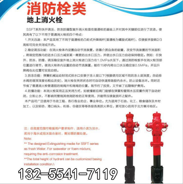 山东东岳起重消防设备制造有限公司生产的SSFT系列室外消火栓主要结构,主要由阀接座,下阀体组件,接管,消火栓壳体(栓炮一体)等零部件组成。可根据需要连接消防水炮或消防水袋,以适应不同的状况。用户可用产品自带的开启扳手调节水压,调节水量的大小,;开启方式为升降轴开启,开启的过程中内部连接杆垂直往下运动,以为内消防水的压力使内部的减压装置分段开启,先一部分水通过通过减压装置向上走,在开始一段时间后再开启另一段,从而达到调压效果;本品在使用时,内部装置在运动过程中将自动排水装置密封,使用完后,原本密封的排水装置的顶杆离开,从而使用完后遗留下来在上半部的水自动排放出来。