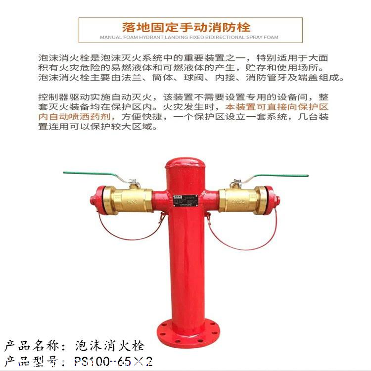 泡沫消火栓特别适用于大面积有火灾危险的易燃液体和可燃液体的产生,贮存和使用场所。泡沫消火栓主要由法兰、筒体、球阀、内接、消防管牙及端盖组成。地上式泡沫消火栓根据法兰接口分为PSS80-65X2、PSS100-65X2、PSS150-65X2三种型号。泡沫消火栓额定工作压力为1.6MPa范围内。