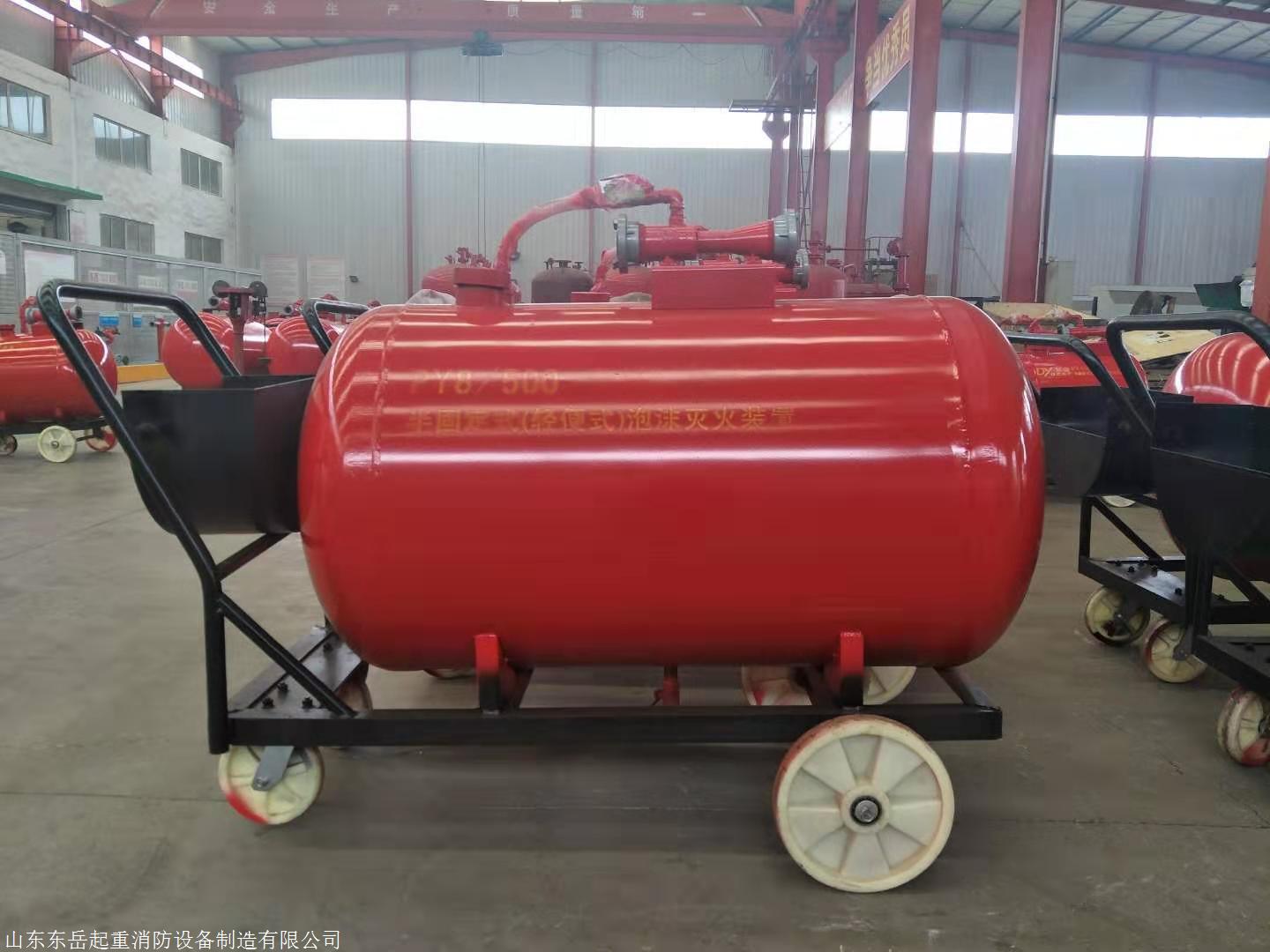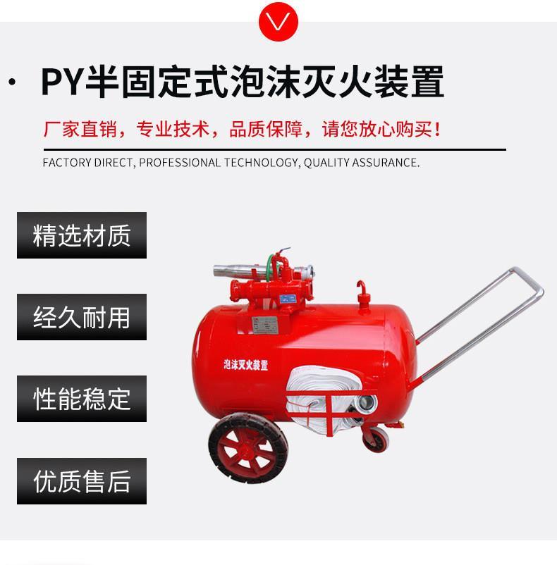山东东岳起重消防设备制造有限公司生产的PY系列半固定式(轻便式)泡沫灭火装置是一种轻便。移动灵活的推车式灭火设备。它采用PHF型管线(负压)式比例混合器,可与泡沫枪及泡沫产生器组成低、中、高倍数泡沫灭火系统,对大型的固定式泡沫灭火系统能起到有效的辅助和补充作用。本装置可由消防管网或城市供水管网、消防车、手抬泵等提供压力水,当压力水经过混合器时,水跟泡沫液按一定比例混合,经泡沫枪。泡沫产生器喷射泡沫扑灭火灾。本产品适用于固体物资仓库、易燃液体仓库、锅炉房、地下建筑工程、车库、船舶等消防场所。
