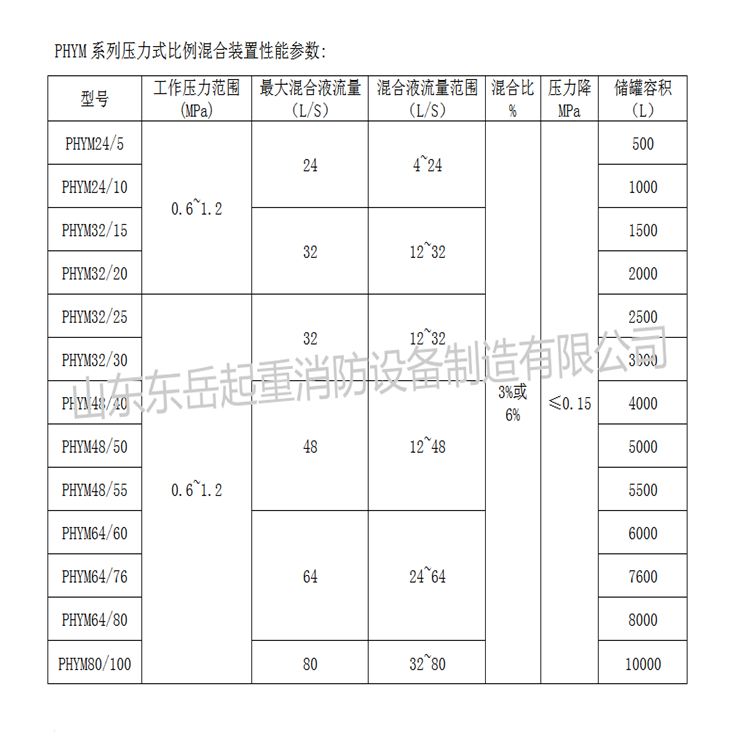 山东东岳起重消防设备制造有限公司生产的PHYM系列压力式比例混合装置简称卧式泡沫罐,严格按照国家标准生产,工艺先进、技术成熟,型号齐备,性能稳定,适用于混合比为3%或6%的各类泡沫液;混合液流量为24-80L/S,泡沫罐容积3000L-10000L。