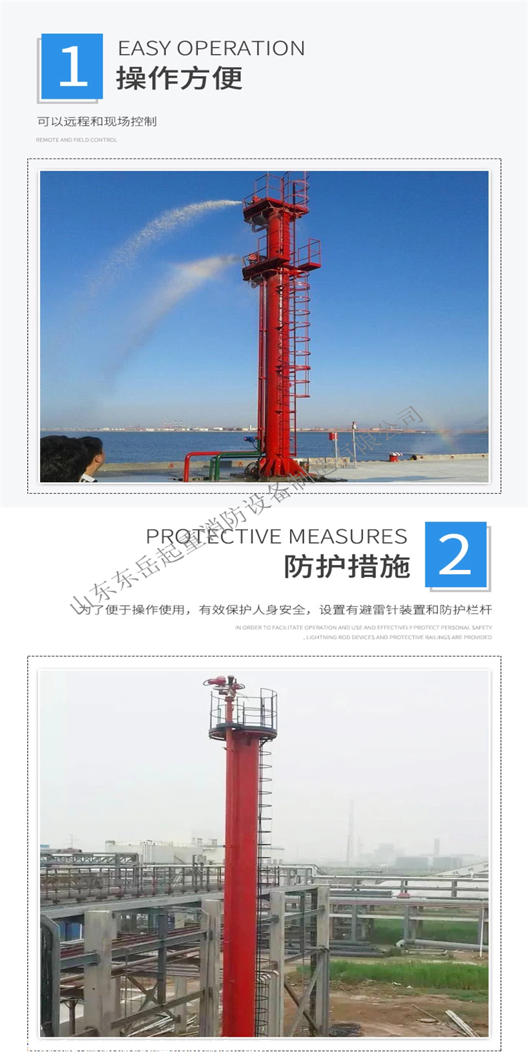 山东东岳起重消防设备制造有限公司生产的PT系列消防炮塔是一种与消防炮配套使用的消防设备。其结构严格国家有关标准设计,安全稳定,并具备一定的安全保护措施和喷淋冷却措施。设有爬梯护笼和避雷保护。