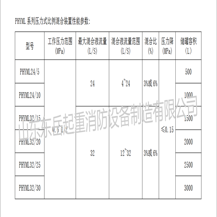 山东东岳起重消防设备制造有限公司生产的压力式比例混合装置按填盛方式分隔膜式、普通型;按罐体放置方式分为卧式、立式两种形式。泡沫混合比一般为3%或6%,亦可提供8%的混合液用于中倍数泡沫灭火系统。该装置混合液流量4-80L/S,贮罐容积有1000-10000L不同规格。根据所需要的混合液流量和泡沫喷射时间,比例混合器和泡沫罐可任意组合成系列产品,以满足工程应用的需要。