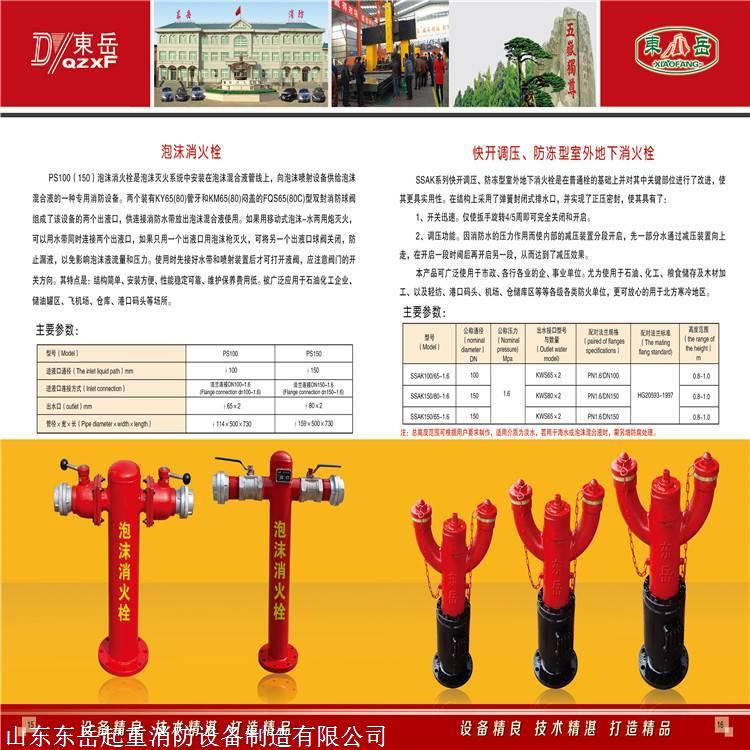 山东东岳起重消防设备制造有限公司生产的地上式泡沫消火栓根据法兰接口分为PS100-65X2、PS150-65X2两种型号。泡沫消火栓额定工作压力为1.6MPa范围内。
