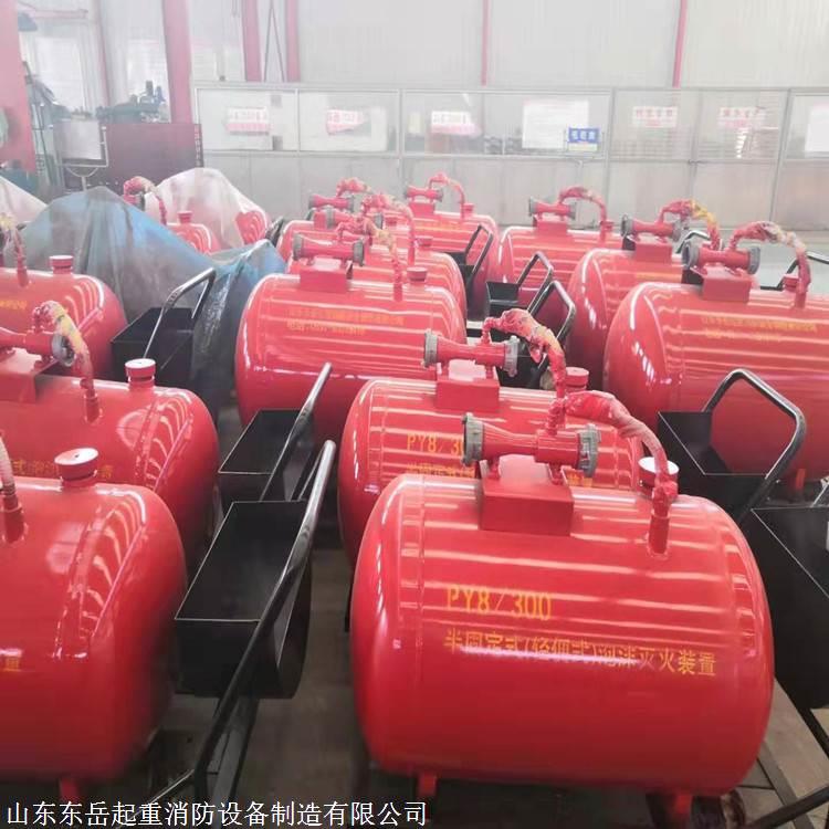 山东东岳起重消防设备制造有限公司生产的PY系列半固定式(轻便式)泡沫灭火装置由罐体、比例混合器、底盘车和水带筐和阀门组成,底部有三个轮子,前面两个为定向轮,后面一个为万向轮可以灵活转动,,罐顶装有PHF型管线式比例混合器和PQ型泡沫枪。当压力水通过比例混合器的喷嘴时流速增大形成负压,吸液管将泡沫原液从罐内吸到比例混合器中与水混合形成泡沫混合液,经过泡沫枪吸入空气后形成泡沫,对准火点,进行灭火。