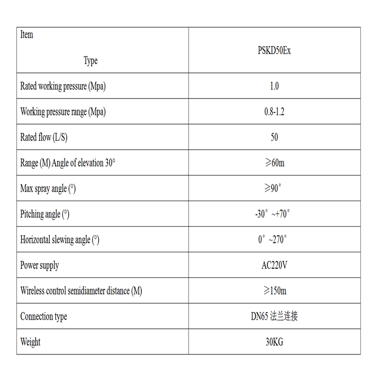 消防水炮在灭火水量上具有流量大、射程远的特点。PSKD-EX系列防爆型固定式消防炮供水可达50~60L/s;水炮仰角30°时,其射程可达60m以上;喷雾角90°以上;俯仰角:-30°~+70°;水平回转角度0°~270°;无线遥控半径距离可达150M以上。