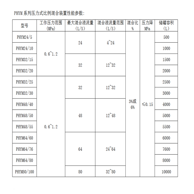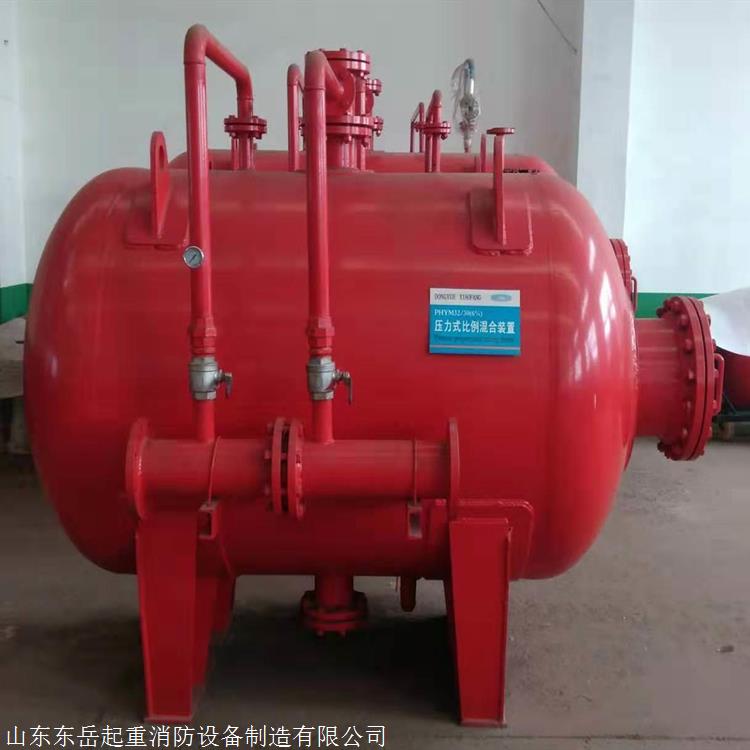 压力式泡沫比例混合装置主要由带的泡沫液压力储罐与利用文丘里原理制成的PHY型压力式比例混合器组成,当系统管网中的水流经比例混合器减压孔板时,在孔板的前后会形成压差。压高处的一部分水(3%或6%)通过泡沫罐的进水管进入罐内,挤压,将中的泡沫液通过泡沫罐的出液管挤压至比例混合器低压处与水混合形成泡沫混合液,形成的泡沫混合液输出到泡沫产生设备(中、低、高倍数泡沫产生器,泡沫枪,泡沫炮等)与空气混合产生泡沫灭火一部分水通过“进水阀”管路进入贮罐水腔,挤压,因喷嘴前后微小的压差,使得内的泡沫液经吸液管被挤出与水混合成为泡沫混合液流,经空气泡沫产生器或其它喷射设备喷出泡沫进行灭火工作。贮罐内有一橡胶制成的,使水与泡沫液分隔开,每次使用后,罐内水和泡沫液没能混合而保持原质泡沫液的性能不变,可以继续使用,避免了泡沫液的浪费。压力式泡沫比例混合装置因为根据不同的应用环境会配置不同的型号。