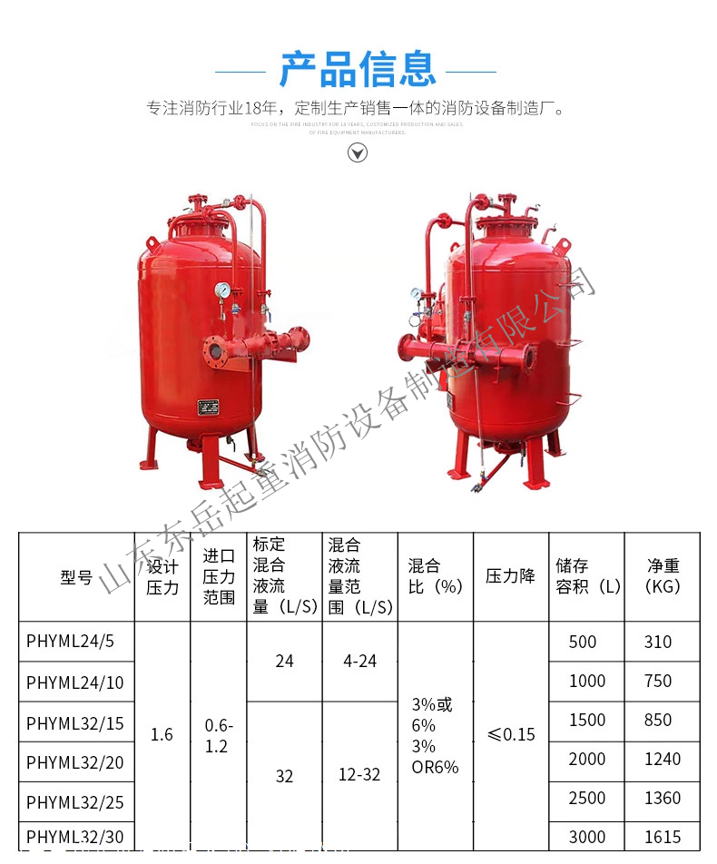 消防泡沫罐主要由带的泡沫液压力储罐与利用文丘里原理制成的PHY型压力式比例混合器组成,当系统管网中的水流经比例混合器减压孔板时,在孔板的前后会形成压差。压高处的一部分水(3%或6%)通过泡沫罐的进水管进入罐内,挤压,将中的泡沫液通过泡沫罐的出液管挤压至比例混合器低压处与水混合形成泡沫混合液,形成的泡沫混合液输出到泡沫产生设备(中、低、高倍数泡沫产生器,泡沫枪,泡沫炮等)与空气混合产生泡沫灭火。