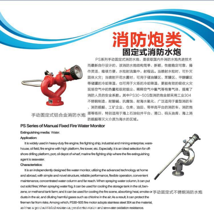 固定式消防水炮是由底座、壳体、喷头、炮筒、水平回转等机构组成,消防水炮炮身可作水平回转、俯仰转动,并能实现可靠定位锁紧,以利消防人员撤离火场,保护消防人员的人身安全。消防水炮具有直流/开花两种喷射功能,当喷射水柱时,可扑灭远距离固体火灾;当喷射开花水雾时,可用于火场降温冷却、消防抢险。因该炮功能齐全、性能稳定、结构新颖、操作方便,消防水炮广泛适用于配备重型消防车、消防舰艇,也可作为工矿企业、仓库、油田、贮罐的固定灭火设备。