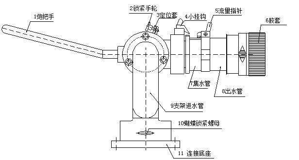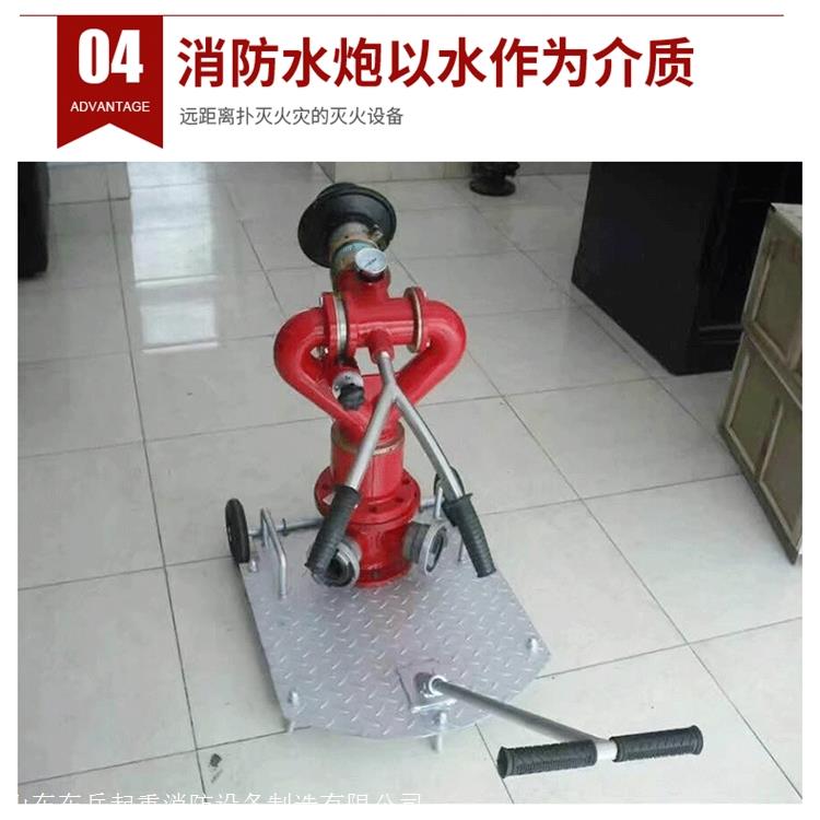 消防水炮由底座、进水管、回转体、集水管、射流调节环、手把和锁紧机构等组成炮身可作水平回转和仰俯回转,并可实现定位。消防炮使用压力范围广,射程远并可实施直流至90°开花、水雾射流的无极调节。其重量轻、体积小、功能全、灭火效果好,是炮的 特点。