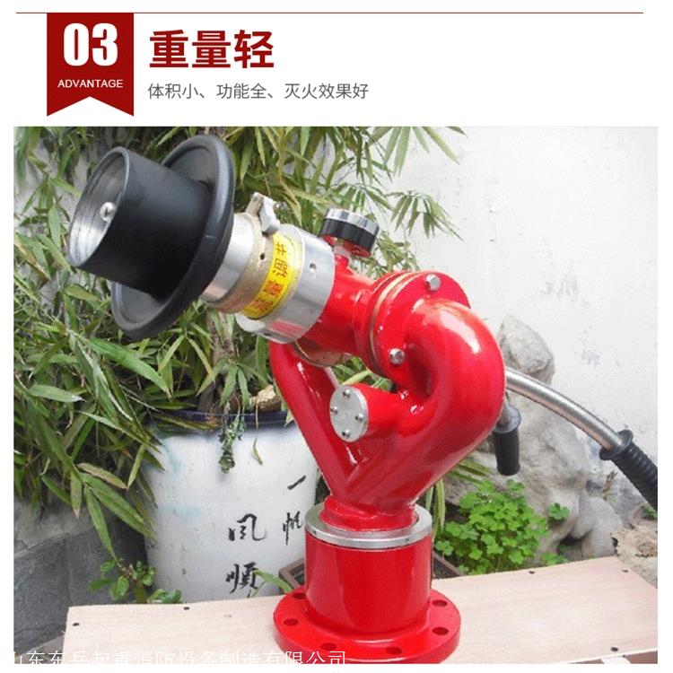 固定式消防水炮是由底座、壳体、喷头、炮筒、水平回转等机构组成,消防水炮炮身可作水平回转、俯仰转动,并能实现可靠定位锁紧,以利消防人员撤离火场,保护消防人员的人身安全。消防水炮具有直流/开花两种喷射功能,当喷射水柱时,可扑灭远距离固体火灾;当喷射开花水雾时,可用于火场降温冷却、消防抢险。因该炮功能齐全、性能稳定、结构新颖、操作方便,消防水炮广泛适用于配备重型消防车、消防舰艇,也可作为工矿企业、仓库、油田、贮罐的固定灭火设备。