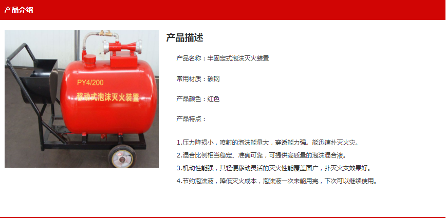 移动式泡沫灭火装置,其操作迅速简便、可靠性强。用于扑灭甲、乙、丙类非水溶性液体火灾。被广泛用于市政住宅区、厂矿企业、油库、化工部门、热处理车间、加油站等场所。
