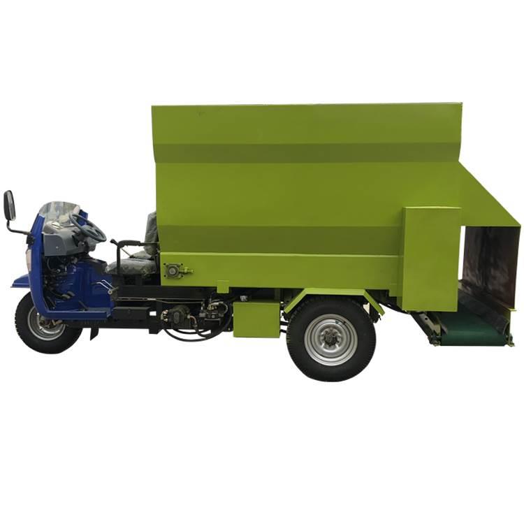 撒料车的主要功能是将成品日粮直接抛撒在饲喂区域内一次性完成饲喂该机由电动三轮车和撒料系统两部分组成,电动三轮车主要从事运输行走及撒料动力,撒料系统是通过主输送和小输送带动完成投喂。操作原理:撒料车开到指定投喂处时,先开启小输送控制开关(左.右),然后再开启大输送并同时开动撒料车进行投喂,停止投喂时先停止大输送开关后再停止小输送。 产品特点:1.该机器采用电动三轮车运送,低能耗,通过性高。2.降低劳动强度,减少饲喂成本。3.可双侧撒料,饲喂更快捷。4.物料抛撒迅速,档位调节撒料速度。5.故障低维修方便。6.敞篷驾驶室内控制所有驱动装置。7.分批投放饲草,针对牛场及羊场分群饲喂,适于规模牧场。8.机动性强、通过性强、转弯半径小,更加灵活方便。9.小型撒料车更合适用于固定式搅拌站,油耗低,效率高,速度快。