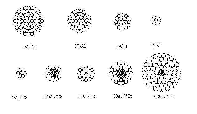 普通铝绞线:型号用 "L J"表示,属于裸导线。目前中国普遍采用铝包钢绞线(LGJ)作为导线,钢芯主要起增加强度的作用,铝绞线主要起传送电能的作。根据电压不同,导线横截面积也不同。比如:目前在500千伏输电线路的导线,一般使用 LGJ-400/35的导线。其中L是铝线的简称,G是钢芯的简称,J是绞线的简称,400是铝400平方毫米,35是钢35平方毫米。