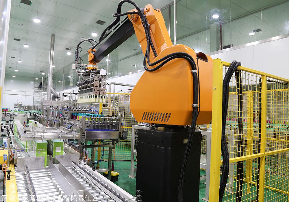 生产线中,进行码垛、拆垛作业的机器人码垛可以灵活布局,可以同时码垛两条线或者多条线,是生产线末端进行码垛作业的理想之选。