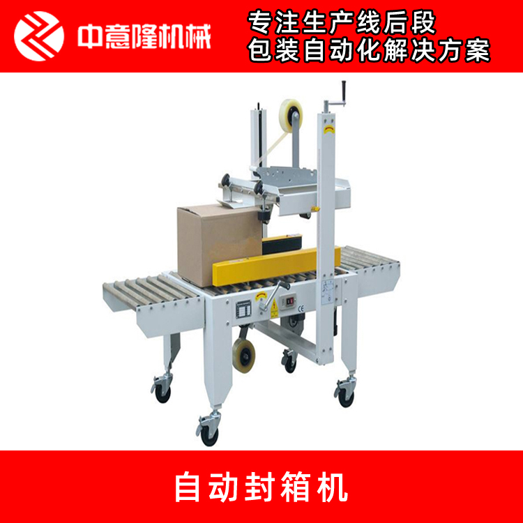 全自动胶带纸箱封箱机 中意隆一字型自动封箱机具有广泛的用途,适用于食品、纺织、家用电器、药品、轻工、日用百货、化工等各种纸箱的封箱,可单独封箱作业,亦可与充填、捆包配套成流流水线使用。全自动封箱机的选择需要适合现场需要,如果没有与其匹配的自动流水线就不适合选择全自动胶带纸箱封箱机 中意隆一字型自动封箱机,可以选择半自动封箱机。