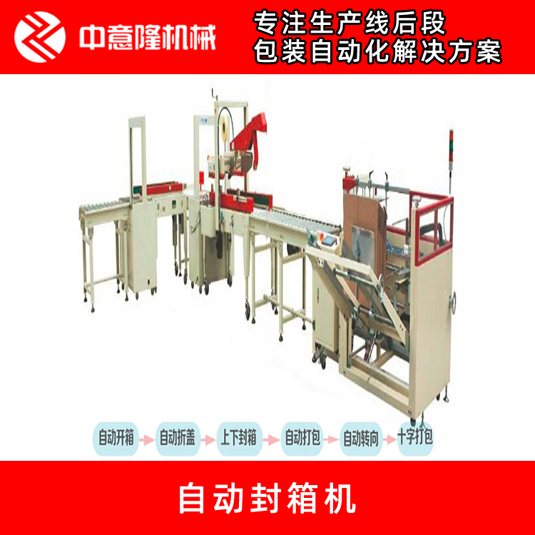 综合国内外各种全自动封箱机特征的基础上,为适应国内生产企业的特点,河南中意隆包装机械新研制开发成功的全自动封箱机应用范围广、占地面积小,性能更可靠,操作简便,能广泛应用于化工、医药、日化、食品、饮料等行业的各种塑料瓶装产品高速装箱。