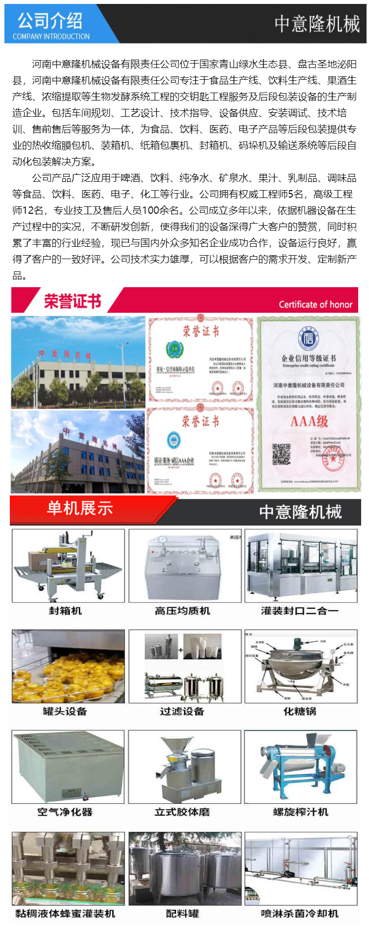 果酒生产线设备有:果蔬清洗机,果蔬破碎打浆机,原水罐,原水泵,石英砂过滤器,活性碳过滤机,加药装置,RO反渗透主机,紫外线杀菌器,纯水罐,恒温化糖罐,搅拌配料罐,糖浆过滤器,恒温发酵罐,过滤机,熟成罐,杀菌设备,消毒浸泡洗瓶机,灌装封口,瓶盖杀菌机,灯检设备,吹干机,贴标机,喷码机等饮料机械设备组成。