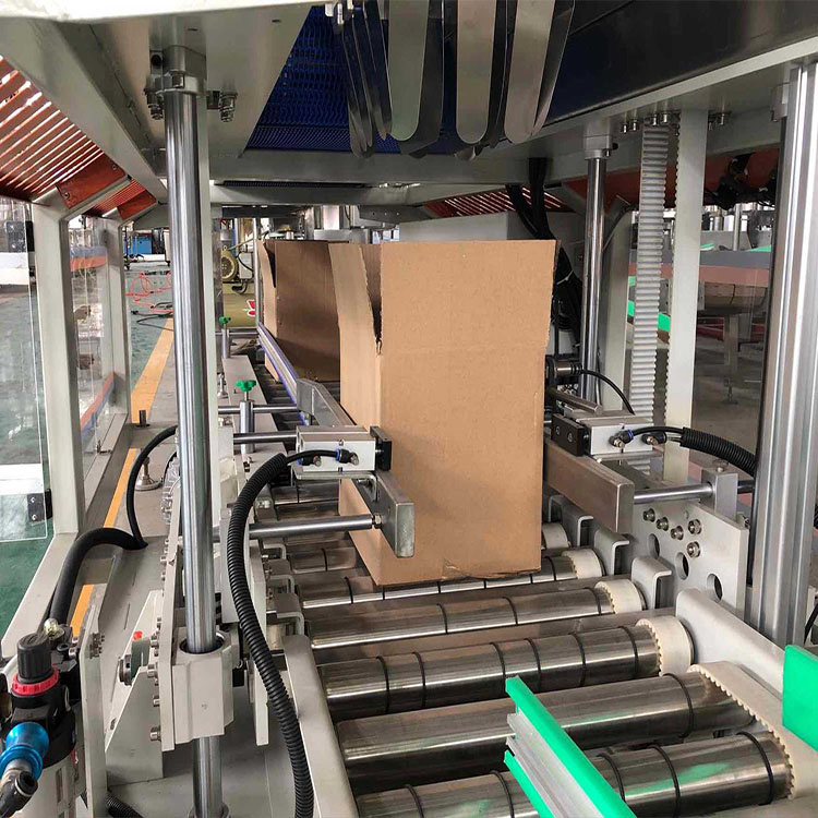 是一种智能性全自动装箱机,采用高速分配装置包装各种容器,包装塑料扁瓶、圆瓶、不规则形瓶,各种大小玻璃瓶,圆瓶、椭圆形瓶、方形罐及纸罐等,另外也适用于带隔板的包装箱。由瓶夹(内置橡胶,以防损伤瓶体)夹住瓶体(每次2箱),放入打开的纸箱当中,当抓头抬起时,将纸箱排出,送至封箱机,本机采用P.L.C + 触摸显示屏控制。设有缺瓶报警停机,无瓶不装箱安全装置。本流水线大大方便操作、管理、减少生产人员和劳动强度,是自动化规模生产必不可少的设备。