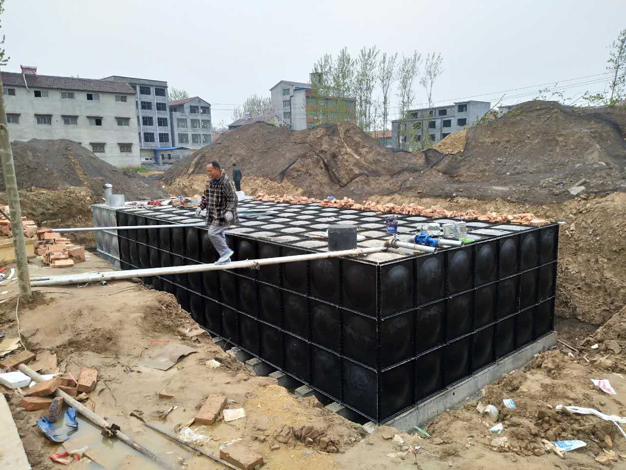 地埋消防泵站箱泵一体化无浮泵站底板连接后,进行墙板和底板连接,螺栓连接是先把一面一面的码好在水箱的底板上,四墙码好后,压边进行调整连接,复尺一般相对角不超过2mm,要求在一条直线上,四角要求底部和墙面连接处90。水箱底部和墙面用螺栓和密封圈密封连接后,再进行顶部和墙面的连接,边与边要求基本在一条水平线上。水箱人孔根据客户要求连接在位置上,一般都设在靠近进水孔浮球处。水箱箱体连接密封好后,接着开进水、出水、溢流、排污、消防孔、后扶梯安装靠近人孔附近。箱泵一体化无浮泵站箱体内部拉筋,采用不锈钢板,经折角机折成90。直角角钢和槽钢,连接在水箱内部,主要起加强作用防止水箱变形,槽钢拉筋是用来焊接水箱底部到顶部间的支撑。拉筋连接是由底部向上50cm处一层,第1层纵横间距为1m×1m,第二层距离第1层50cm,高度和间距以此类推。墙体与墙体、墙体与底板、墙体与顶板之间用角钢连接。各项工作结束后,如现场具备试水条件,对水箱进行注水试压,检查水箱四周密封处,有没有渗漏或渗水现象。场外清理,水箱经业主负责人和监理验收合格后,交付使用。