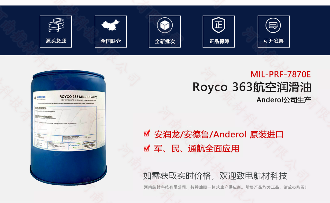 Royco 363润滑油符合标MIL-PRF-7870C,是一种注于低温环境润滑的通用航空润滑油,可用在零下55℃的极寒环境中。该油不仅仅可以用于涡轮发动机,亦可以用于飞机的保养与维护,起到防锈、防腐的作用。