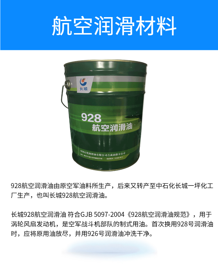 长城928航空润滑油 符合GJB 5097-2004《928航空润滑油规范》,用于涡轮风扇发动机,是的制式用油。换用928号润滑油时,应将原用油放尽,并用926号润滑油冲洗干净。